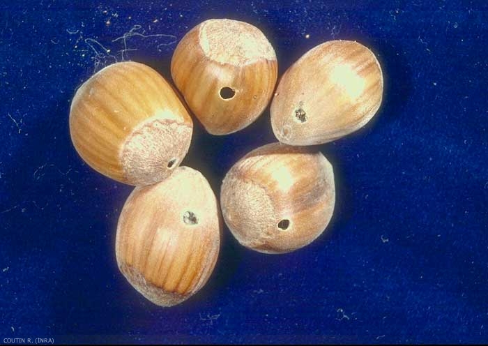 La larve ronge l'amandon, qui est progressivement remplacé par les excréments secs. Les noisettes attaquées sont perdues (figures 3 et 4).