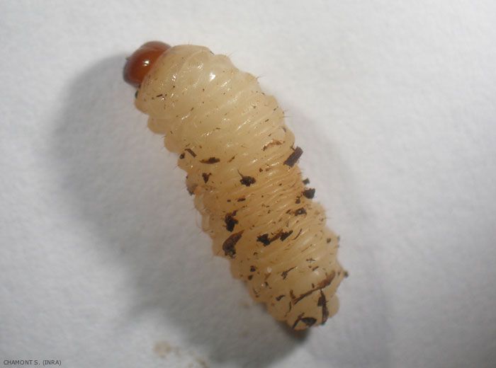 La larve mesure 15 mm, elle est apode, épaisse, incurvée, blanc crème à tête brune (figure 2).