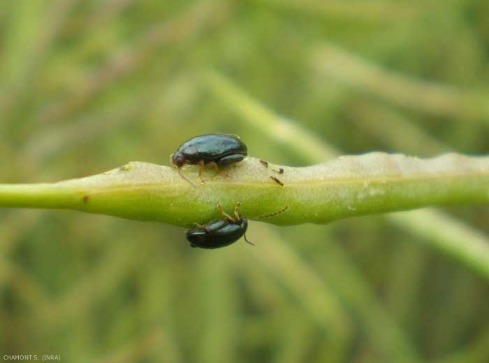 Plus tard, l'adulte s'attaque aux feuilles des plantes âgées, provoquant leur affaiblissement (figure 4). Les pieds attaqués par les larves présentent un aspect buissonnant et un retard de montaison par rapport aux pieds sains. La maturité est irrégulière et le rendement est diminué.
