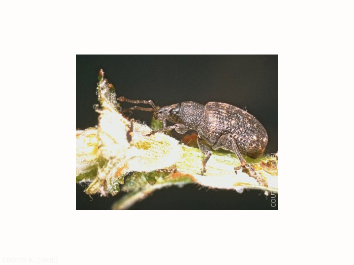 L'adulte mesure de 8 à 10 mm. La face dorsale est noire, la face ventrale grise (figure 1). Les fémurs sont munis d'une forte dent. Le rostre est long, non caréné et fortement sillonné longitudinalement. Le prothorax est légèrement plus large que long, légèrement arqué sur les bords, présentant de gros granules serrés et arrondis bien marqués. Les élytres sont oblongs, ornés de 10 stries et recouverts de petits poils blancs ou mordorés.