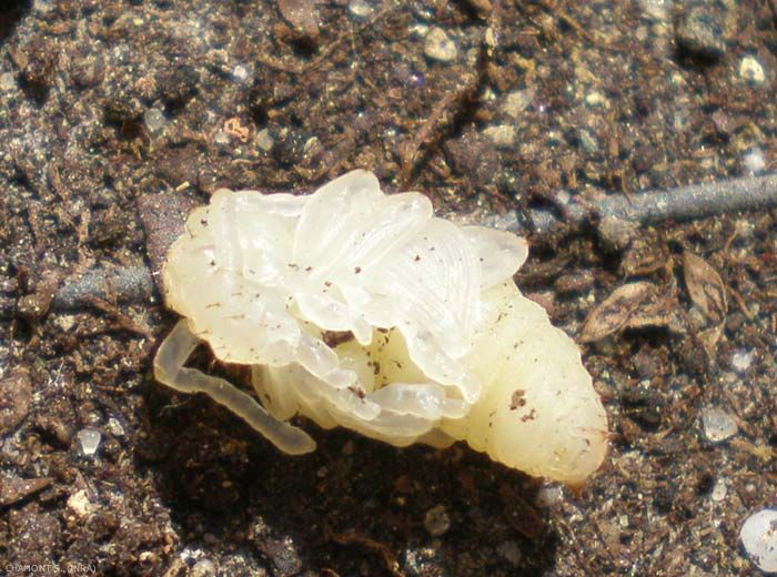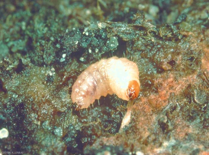 - Les dégâts sur les cultures :L'oeuf est presque sphérique, et mesure 1 mm de diamètre. D'abord brun, il devient presque noir au bout de quelques jours. La larve est blanche, apode, avec un corps fortement incurvé et une grosse tête brune (figure 2).