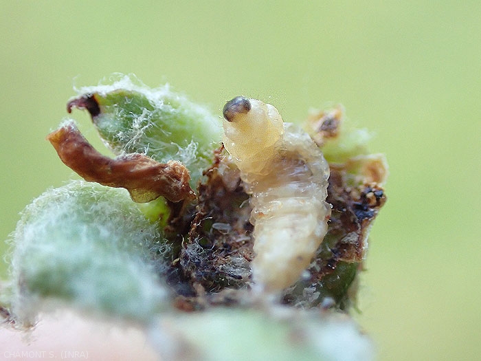 Ce coléoptère diurne se nourrit par piqûres dans les bourgeons de stade D. La larve se nourrissant à partir des organes de reproduction de la fleur, celle-ci ne s'épanouit pas et prend l'aspect d'un "clou de girofle" (figure 3). Lorsque le débourrement est lent (printemps froid), l'anthonome peut déposer tous ses oeufs dans des bourgeons parvenus au stade favorable. Les dégâts sont alors beaucoup plus graves.