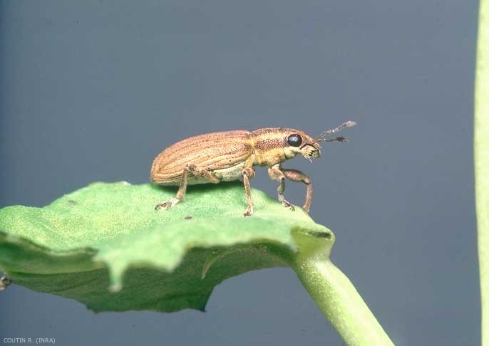 L'adulte a un corps allongé, gris-brun, long de 4 à 5 mm et muni d'un rostre très court (figure 1).