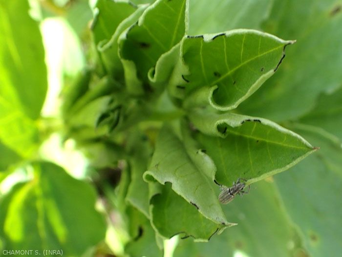 Sur le pois protéagineux et la luzerne, les encoches pratiquées par les adultes sur les feuilles peuvent limiter la densité des jeunes semis (figure 2). De plus, les attaques des larves qui se nourrissent des nodosités et des racines entraînent des retards de végétation.