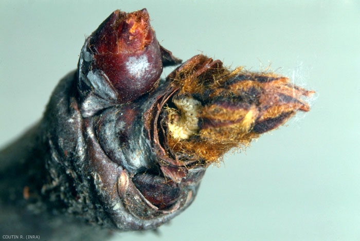 La larve, dès son apparition, se développe aux dépens du bourgeon à fleurs, et dévore les futurs organes floraux à l'intérieur du bourgeon (figure 2) puis se nymphose dans celui-ci.