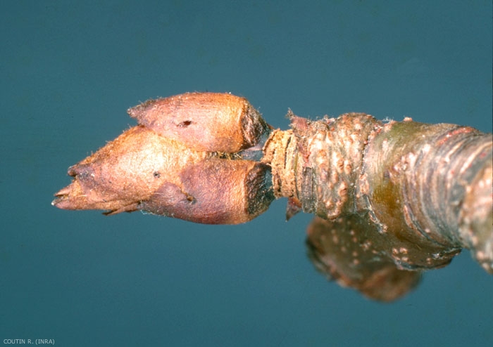 La ponte débute 12 à 15 jours après l'apparition de adulte en septembre : la femelle perfore les bourgeons à fleurs à l'aide de son rostre et dépose un oeuf dans le fond de la cavité (figure 1). Elle obture ensuite le trou de ponte à l'aide d'une substance jaunâtre qui durcit à l'air. La fécondité moyenne est généralement de 12 à 15 oeufs. Les oeufs pondus en automne à l'intérieur des bourgeons éclosent à la fin de l'hiver et au début du printemps.
