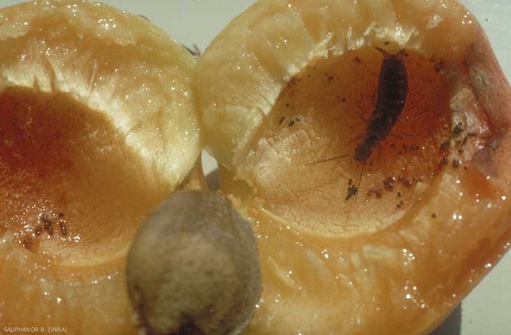 Ces blessures, ainsi que les tentatives de pénétration, peuvent favoriser l'installation de maladies fongiques comme la moniliose. Dans certains cas, la forficule est plutôt un auxiliaire et peut détruire, même sur les cultures précitées, des ravageurs comme les pucerons (figure 4).