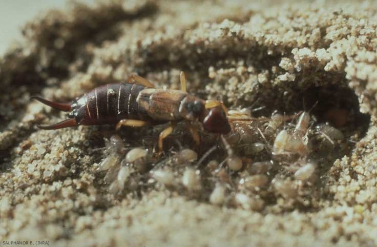 Les oeufs et les larves de 1er stade sont l'objet de soins maternels, déplacements et toilettes (figure 2) et humectation en permanence, au sein du terrier d'où le mâle est alors exclu.