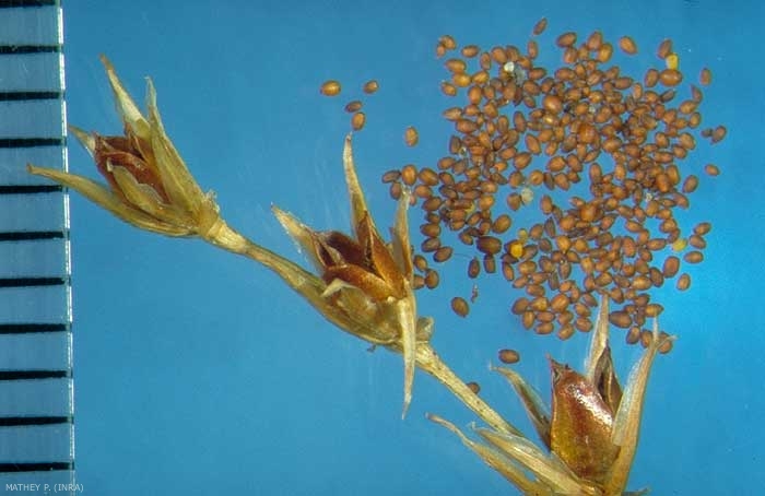 Fruit contenant les graines : capsule entourée des pièces florales, contenant une graine.