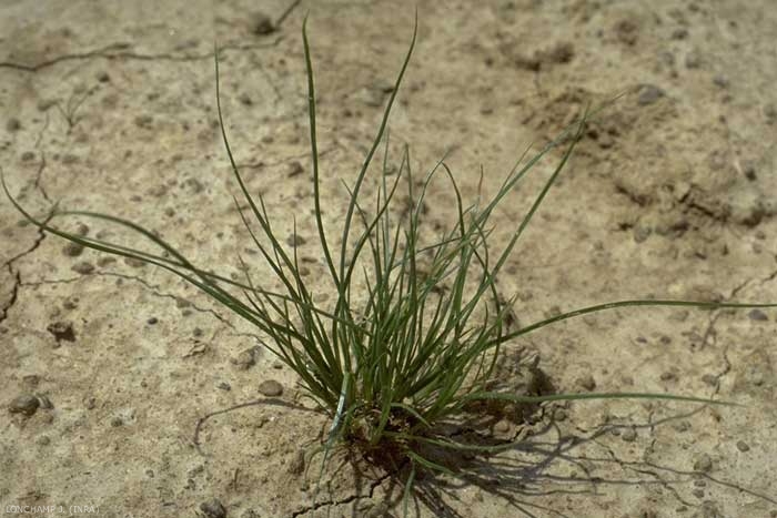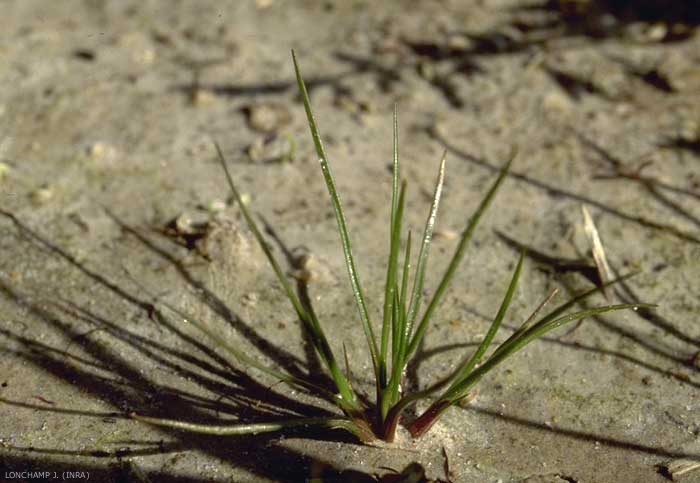 Feuilles inférieures disposées en rosette, feuilles toutes identiques, linéaires, canaliculées qui se rétrécissent progressivement en une pointe fine. Première feuille très courte portant souvent à son extrémité les téguments de la graine. Feuilles étroites (9 cm de long pour les inférieures, les supérieures beaucoup plus courtes). Gaines membraneuses ou à bords membraneux, non auriculées