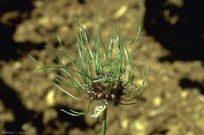 Tige cylindrique, pleine, feuillée jusqu'au milieu. Bulbe entouré de bulbilles (figure 2)