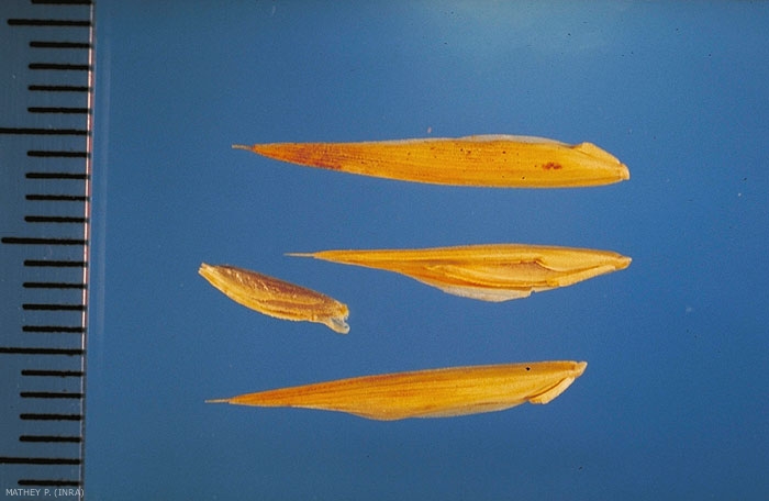 Glumelle supérieure (paléole) et caryopse ne dépassant pas la moitié de la lemme.