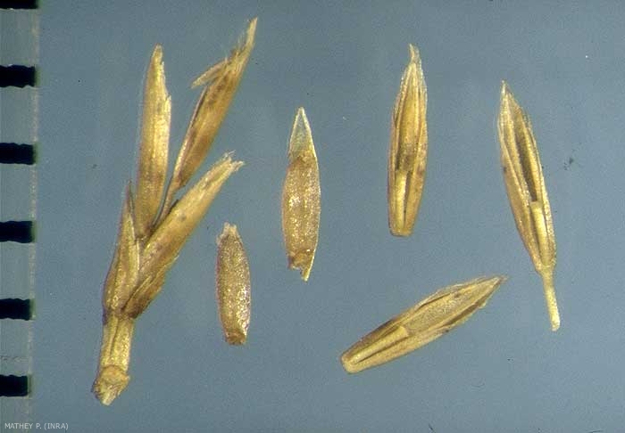 Fruits : caryopses contenant une semence de forme trapue, à peine plus de 3 fois plus longue que large ; caryopse avec les 2 glumelles et la baguette.