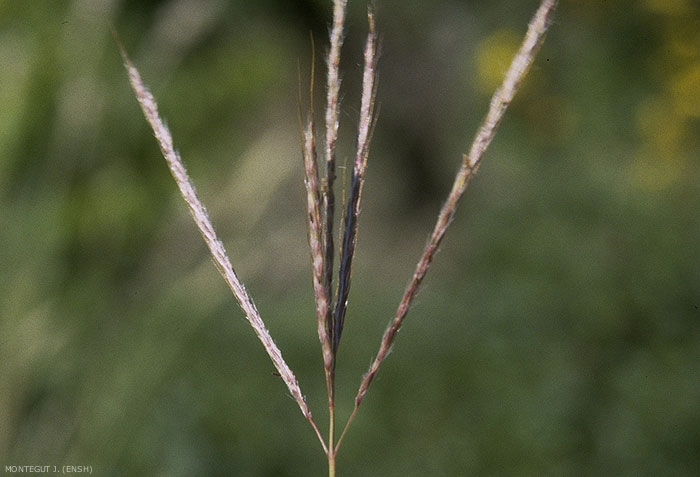 Inflorescence violacée, fasciculé composée de 5 à 12 épis digités, velus et soyeux. Épillets par paires, l'un pédicellé et non aristé, l'autre fertile et sessile