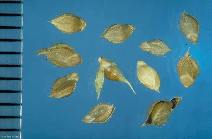 Lemme de la fleur fertile coriace et luisante enveloppant entièrement le caryopse, celle de la fleur stérile aiguë avec une arête de 1 à 2 mm scabre. Présence de poils épineux.