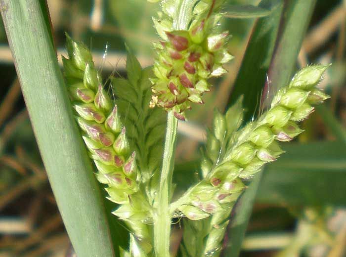 Inflorescence : panicule contractée, verte ou violacée, formée d'épis dressés ; épillets velus hérissés (3 à 4 cm), glumelle inférieure de la fleur stérile mucronée ou longuement aristée