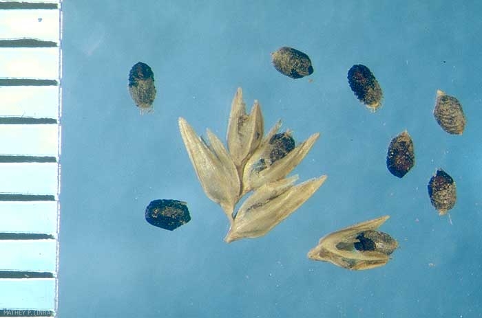Caryopse brun-noir recouvert d'une membrane détachable sur le sec à face ornementée par des replis en croissant.