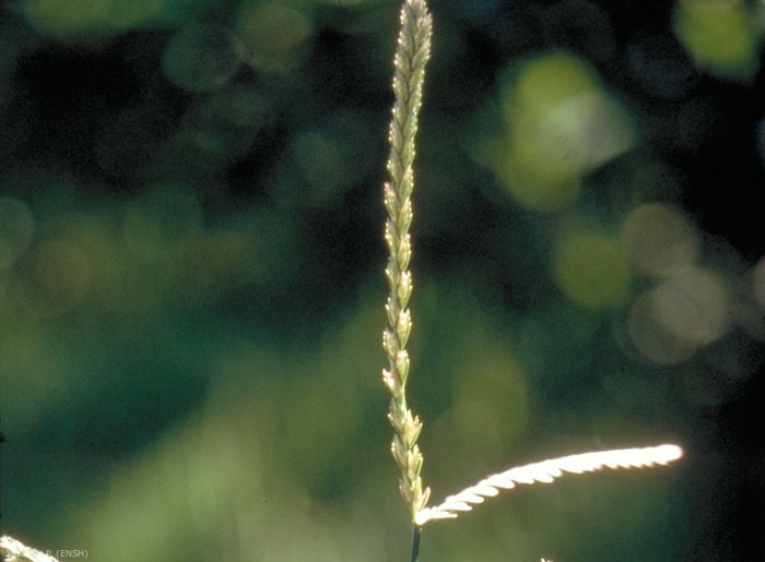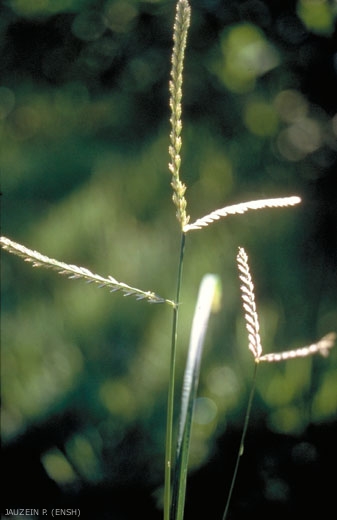 Inflorescence : 2 à 7 ramifications en épi disposées radicalement en bout de chaume, certaines ramifications peuvent aussi être insérées plus bas, épillets à plusieurs fleurs fertiles, comprimés sur leur axe, glumes inégales, glumelles presque égales. Epis raides, blanchâtres de 3-10 cm x 6 mm.