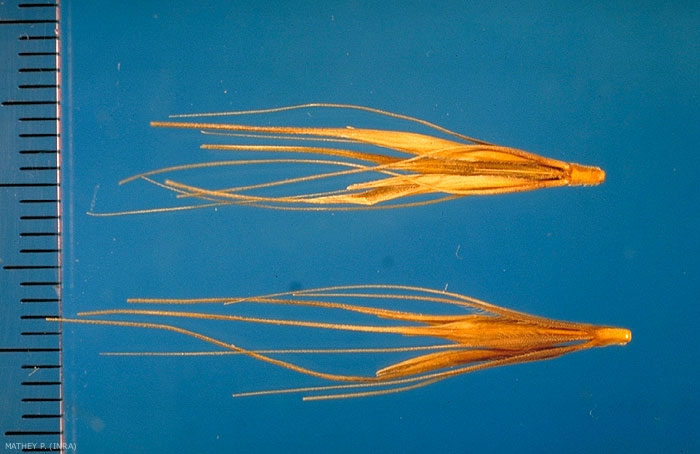 Un seul épillet fertile par fascicule, les stériles uniflores. Glumes longuement aristées, celles de l'épillet central fertile, velues. Glumelle inférieure à 5 nervures rudes sur le sommet, lancéolée, arrondie sur le dos.