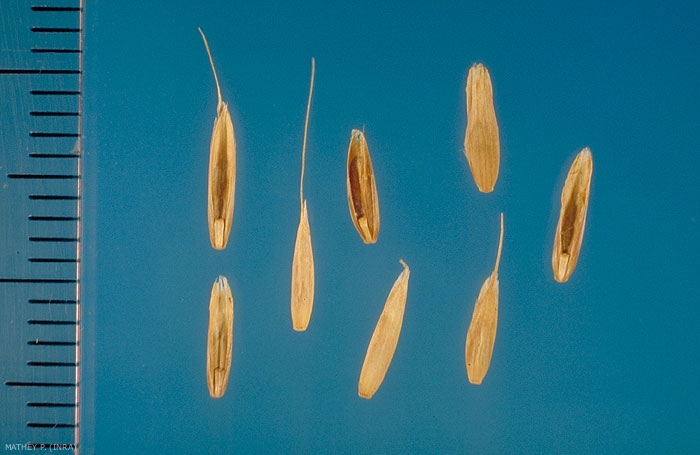 Semence généralement dispersée avec 1 fleur entourée des glumelles. Présence d'une baguette à la base de la glumelle inférieure (lemme)