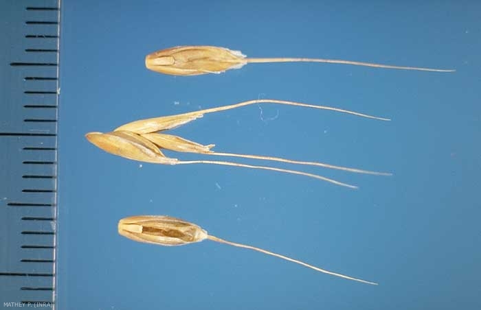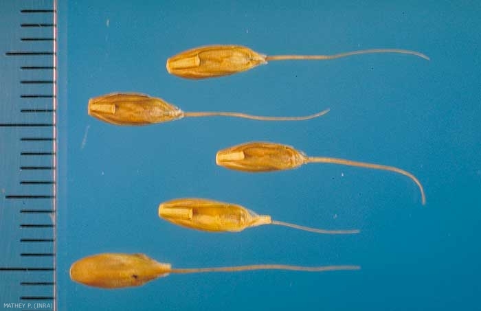 Semence généralement dispersée avec 1 fleur entourée des glumelles. Présence d'une baguette à la base de la glumelle inférieure (lemme) ;