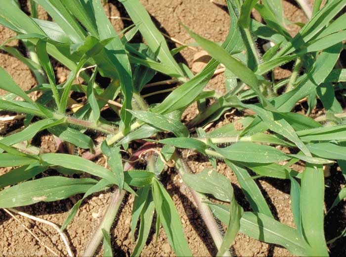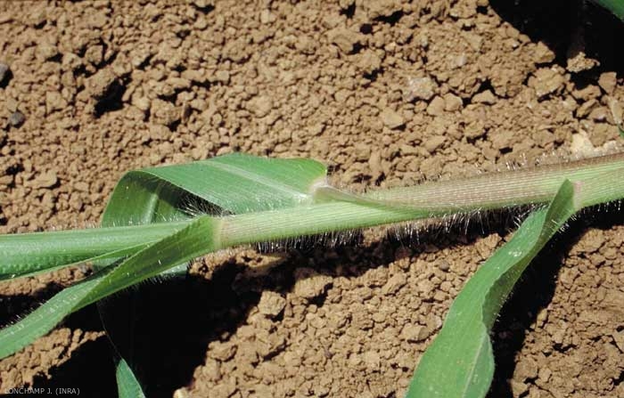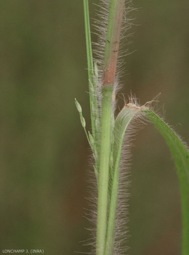 Feuilles d'aspect étroit et long. Cils longs et denses sur les noeuds. Feuilles poilues sur les 2 faces, ciliées à la base, de 15 mm de largeur et 20 à 25 cm de longueur. Nervure médiane, blanchâtre, discrète. Pilosité longue et abondante. Gaine poilue à section arrondie, fréquemment maculée ou veinée de teinte rose ;