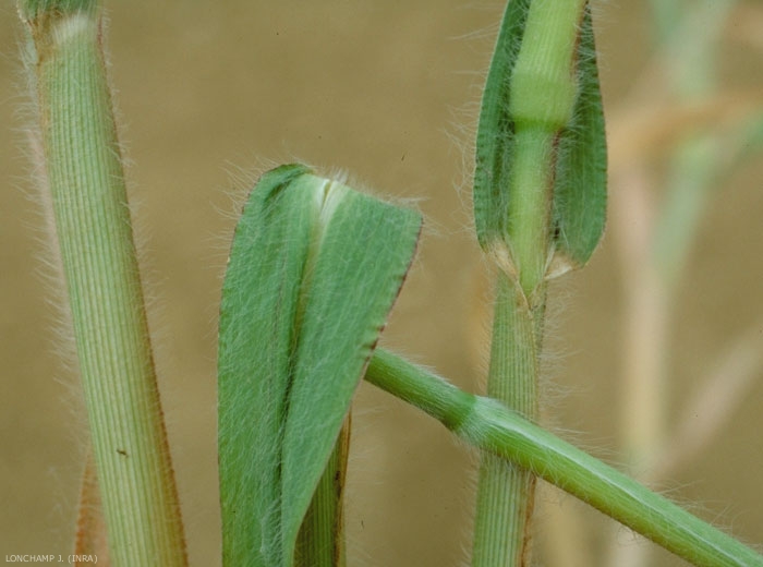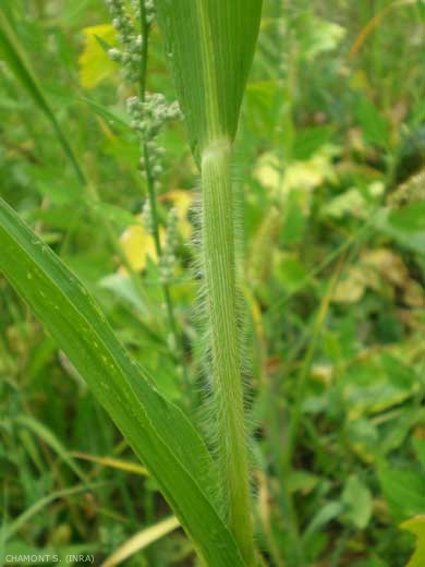 Feuilles larges de 15 à 30 mm, très longues (45 cm), ciliées dans leur partie basale et poilues sur leurs 2 faces, à gaines hérissées de longs poils. Limbe poilu et longuement cilié dans sa partie basale, d'aspect large et court. Pilosité longue et abondante. Gaine poilue à section arrondie non maculée ni veinée de teinte rose ;