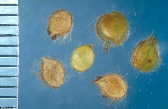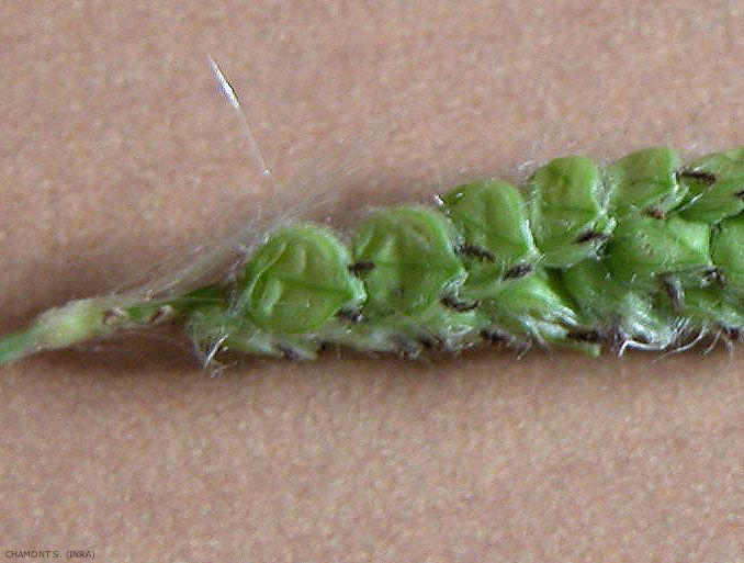 Fleuron fertile à peine plus long que large ; poils blancs sur la marge de la glume supérieure et de la lemme stérile.