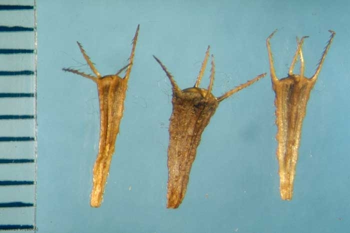 Akènes oblongs-cunéiformes, longs de 5 à 6 mm. tronqués au sommet surmonté ordinairement de 4 arêtes subulées, épineuses.