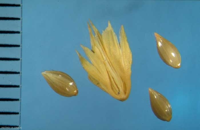 Un seul épillet est fertile, le caryopse est brillant ;