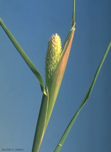Inflorescence en forme d'épi rétréci aux 2 extrémités, restant généralement partiellement prisonnière de la gaine ;