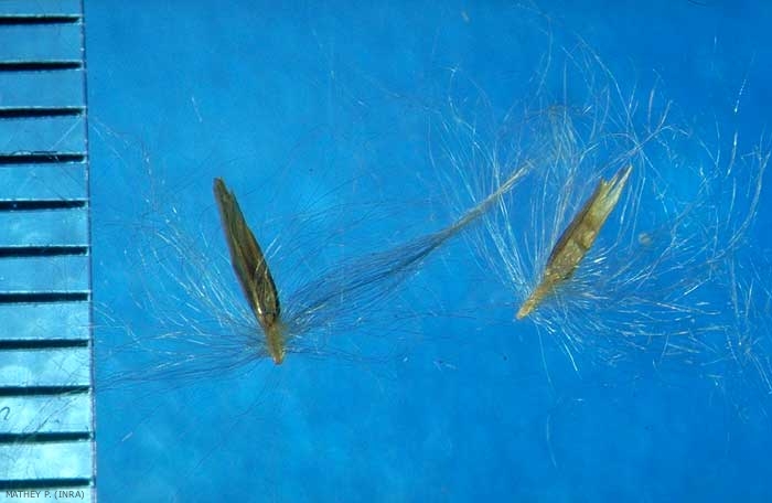 Semence généralement dispersée sans les glumes et constituée d'une seule fleur fertile, portant de longs poils soyeux aussi longs qu'elle. La semence se prolonge à sa base par une portion pédicellaire d'où partent ces poils soyeux ;