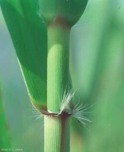 Ligule remplacée par une ligne de poils, limbe non auriculé à la base, touffes de poils de part et d'autre de la base du limbe.