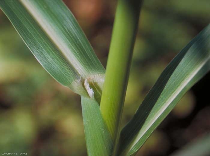 Feuilles larges de 1 à 2 cm, planes, scabres, à nervure médiane épaisse, blanche non proéminente, pilosité dense appliquée à la base de la feuille. Au delà du stade 3 feuilles gaine progressivement aplatie ;
