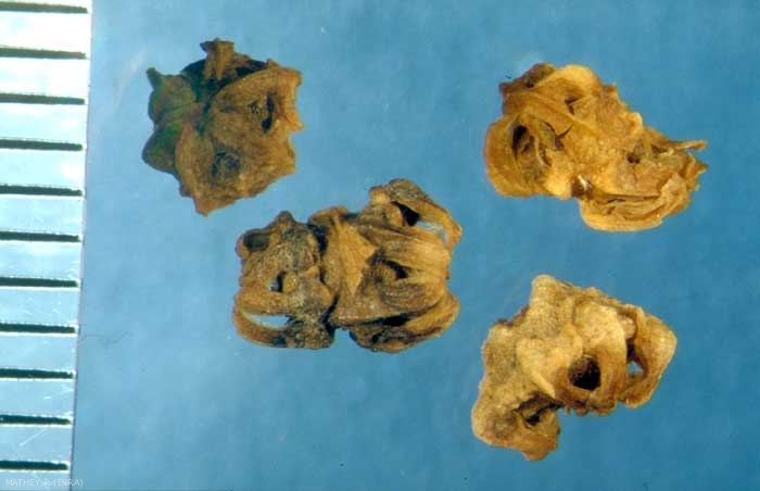 Forme : semence formée de 5 sépales indurées, espacées mais se rejoignant sur le sommet du fruit. Ce périgone, dur et ligneux à maturité laisse voir +/- le fruit par des ajours
