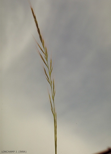 Inflorescence : panicule spiciforme (10 à 20 cm), verte ou violacée. Épillets de 4 à 8 fleurs cléistogames à axe glabre, glumelle inférieure à arête plus longue qu'elle.