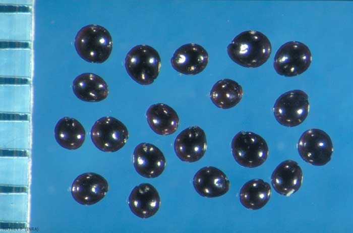 Forme : contour ovoïde apiculé (bec racinaire), graine lenticulaire avec amincissement équatorial