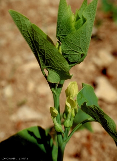 Fleurs jaunâtres, réunies par 5 à 6 en faisceaux axillaires et sépales soudés en cornet tordu jaune vif, attirant les insectes