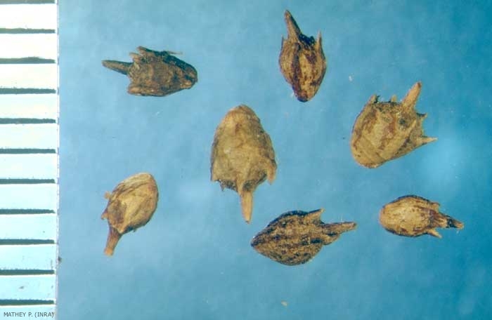 Fruits petits de 4 à 5 mm de long, plus longs que larges, cylindriques presque lisses, munis sous le sommet d'un verticille de 5 à 6 épines dressées et aiguës terminées par un bec presque entier.