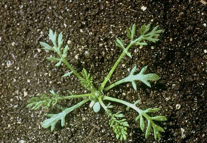 Feuilles finement divisées à divisions très fines linéaires, à poils épars raides et blanchâtres sur la face inférieure