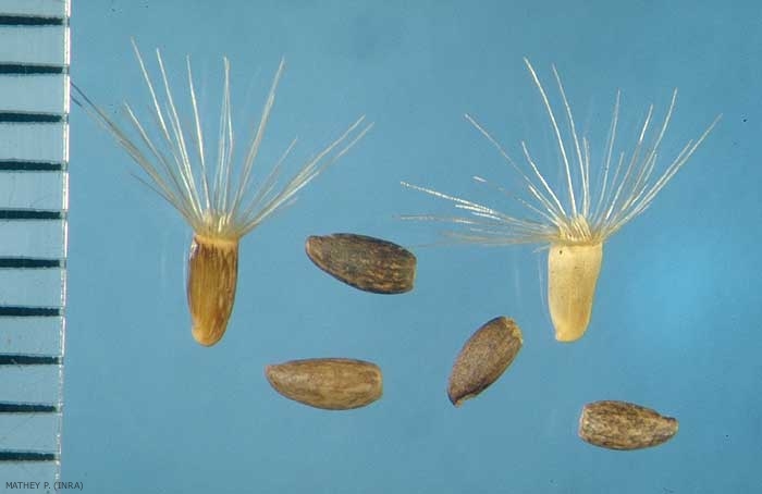 Fruits mûrs grisâtres, sans poils, luisants, de 2 à 3 mm de long (sans compter l'aigrette). Aigrette blanche plus longue que le reste du fruit.