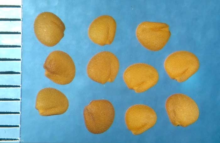 Forme : ovoïde à triangulaire, déformée par le hile entouré de la hernie racinaire et d'une hernie tégumentaire ;