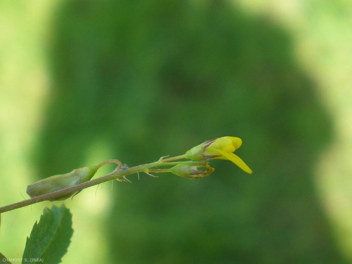 Fleurs jaunes solitaires ou groupées par 2 ou 3, rameau florifère plus court que la feuille, se terminant par un prolongement grêle qui ne porte pas de fleur. Étendard plus long que la carène, elle-même plus longue que les ailes ;
