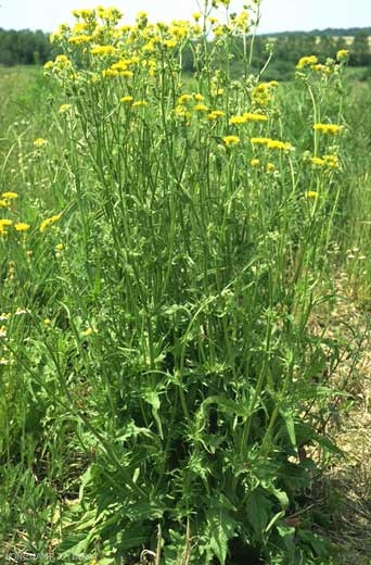 Fleurs jaunes, les extérieures rougeâtres en capitule. Capitules nombreux, longuement pédonculés, de dimensions moyennes. Bractées de l'involucre souvent très larges donnant au capitule un aspect renflé