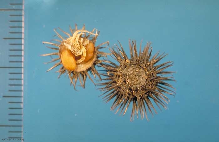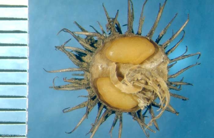 Fruit contenant les graines : gousse enroulée, à spires imbriquées ; spiralé de 5-8 mm de diamètre et 3-4 mm d'épaisseur, à épines longues (> 2 mm), droites recourbées à l'extrémité.