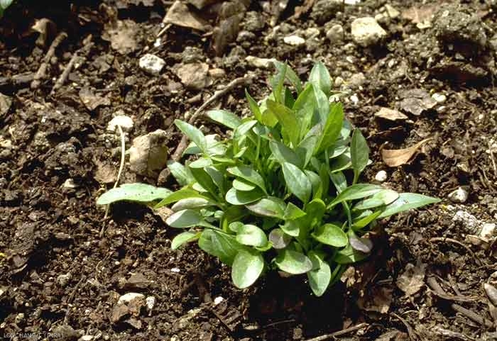 Feuilles de la rosette arrondies et pétiolées, couvertes de poils blanchâtres ; feuilles suivantes obovales, à limbe progressivement atténué en pétiole.