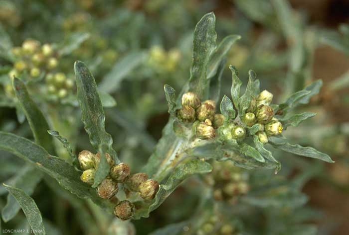 Fleurs centrales jaunâtres tubuleuses, peu nombreuses, fleurs périphériques jaunâtres, également tubuleuses, peu nombreuses en capitules larges de 2 à 3 mm, par 3 à 10 en glomérules terminaux largement dépassés par les feuilles. Bractées de l'involucre en rangs nombreux, membraneuses, brunes, presque glabres, récurvées à la fructification