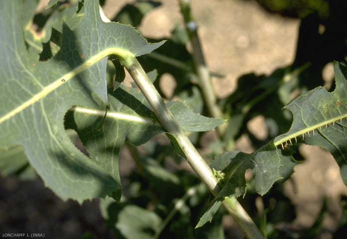 Feuilles sessiles embrassantes à limbe étalé horizontalement, denté ou sinué rarement lobé, épineux sur les bords et en dessous sur la nervure principale. Présence de latex ;