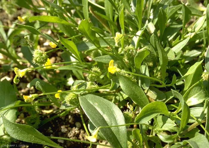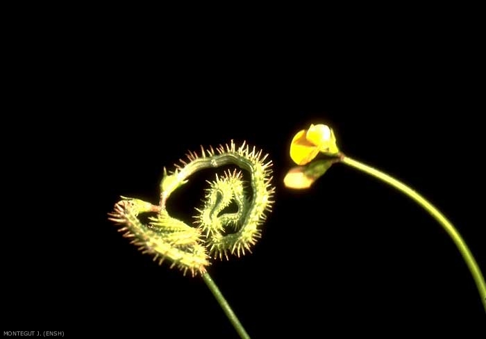 Fruits : gousses glabres, fortement sillonnées, contournées en spirale, toutes dans un même plan horizontal à côtes intérieures lisses, les 4 dorsales seules hérissées d'aiguillons grêles, raides, assez écartés.