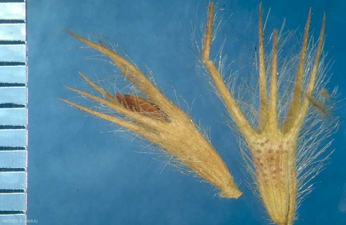 Forme : ellipsoïde tronquée, présence d'une hernie racinaire peu marquée mais la fossette du micropyle est très visible latéralement ;